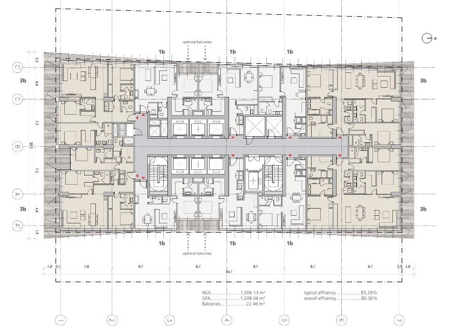 Typical floorplates are designed for maximum efficiency achieving over 83% ratio of GFA over NLA without balconies. Lower levels contain total of 12 apartments, 8 x 1 bedrooms, and 4 x 2 bedrooms located strategically on building corners. Upper floor plates have 10 apartments per level with 6 x 1 bedrooms and 4 x 3 bedrooms.